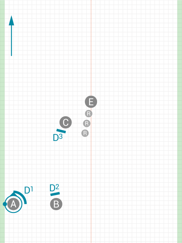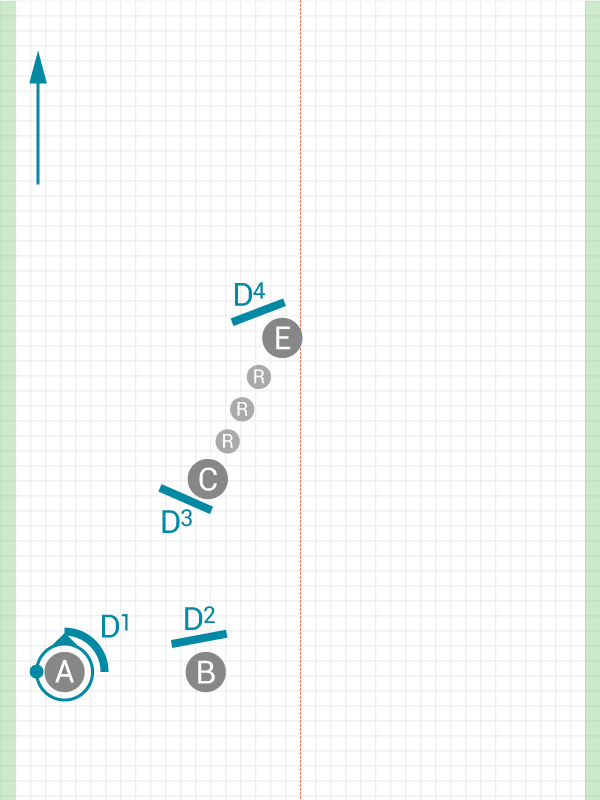 A coordinated cutting pattern that gets the disc out of a sideline trap efficiently