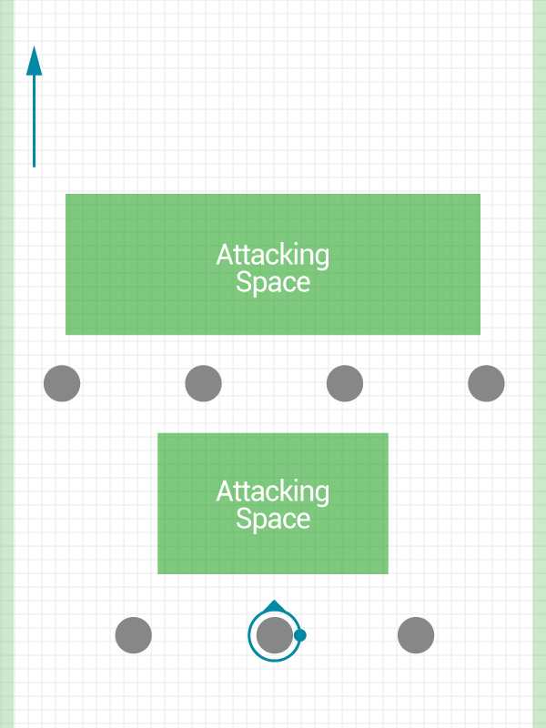 The idea behind horizontal stack is to create “attacking space” in front of the disc and give cutters ample opportunity to attack into the space. It is called horizontal because handler and cutters are spread across the field horizontally and the disc is swung horizontally to reset where the attacking space is. Once the attacking space is determined (area in front of the disc regardless of force), cutters string cuts together to open up that space and allow teammates to go one-on-one in the newly vacated attack space.